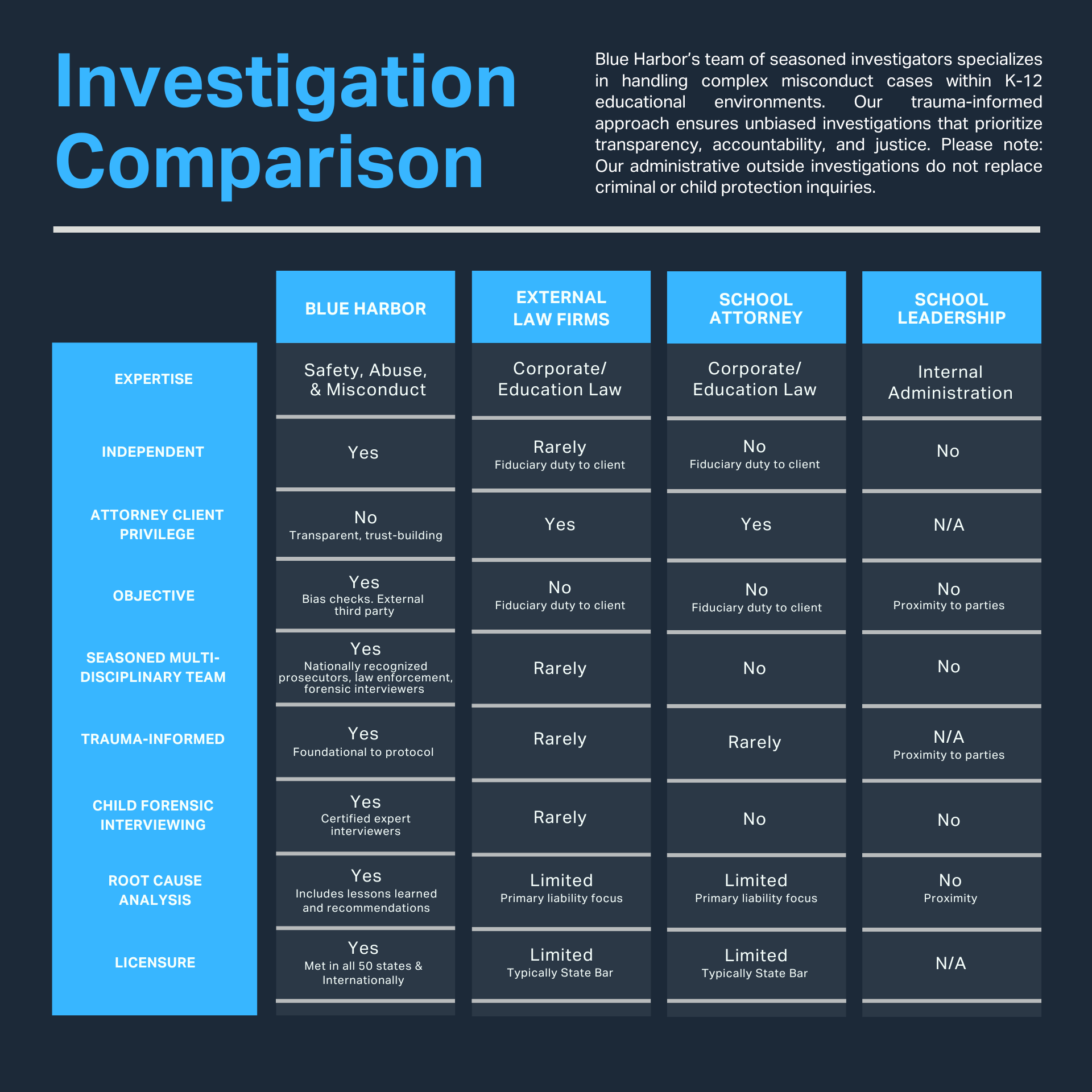 Note: A Blue Harbor investigation or consultation does not replace the legal obligation to report to law enforcement or Child Protective Services. Criminal investigations focus on the prosecution of offenses; our independent investigations focus on individual conduct, public safety, and institutional response.